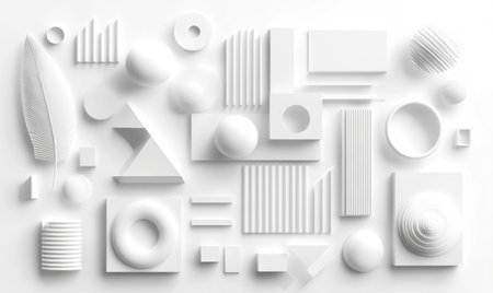 Simple showing arrangement of white geometric 3d shapes including cubes spheres pyramids and rectangles on a white surface in a minimalist composition keywords:...