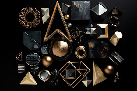 A stunning layout of golden geometric shapes on a sleek black satin background, showcasing various forms and textures, perfect for design inspiration and decor themes.
