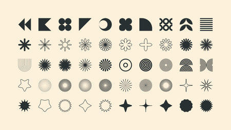 Abstract stars, flowers, waves, crosses shapes collection. Primitive geometric forms set in Swiss, bauhaus or Memphis style. Brutalist elements pack for poster, banner, collage. Vector signs bundle.