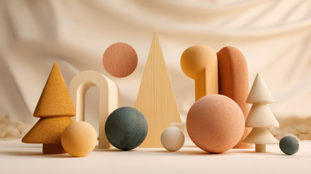 A captivating arrangement of colorful wooden shapes on a soft background, ideal for minimalist designs, art projects, or educational purposes.