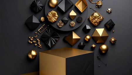 sophisticated arrangement of black and gold geometric shapes, including spheres, pyramids, and multifaceted objects, on a dark grey surface with a gold-accented platform