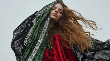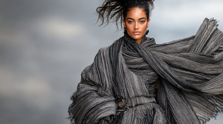 A Dramatic layered outfit with elegant pose and flowing fabric in motion