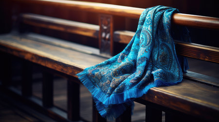 A richly patterned silk scarf with vibrant colors elegantly drapes over a rustic wooden chair, illuminated by soft daylight. the composition highlights the intricate details and textures, creating a warm, artistic atmosphere.