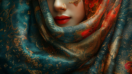 This image captures a stunning close-up of vibrant fabric adorned with intricate patterns, showcasing rich colors and exquisite textures perfect for fashion or home decor.