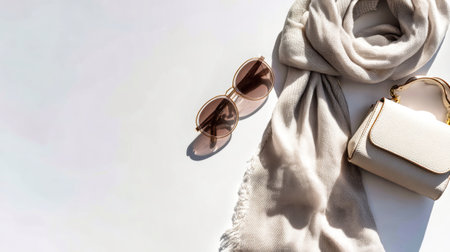 Embrace timeless elegance with a flat lay of a chic scarf, stylish sunglasses, and a small handbag in soft white tones. Perfect for fashion inspiration.