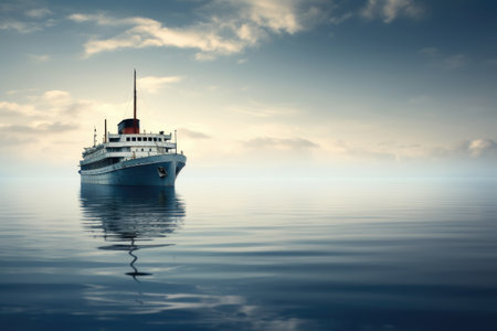 A massive boat effortlessly glides upon the endless expanse of a serene body of water, An empty cruise ship sailing in the middle of the ocean, AI Generated