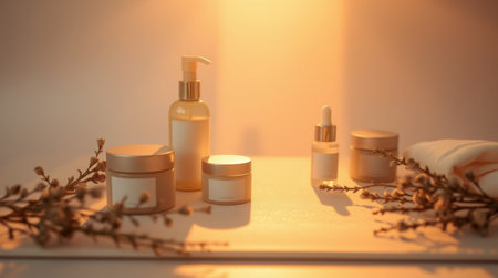 Luxurious skincare products arranged on a soft surface, bathed in warm, golden light. Elegant and minimalist aesthetic.