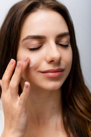 Close-up portrait of attractive young woman using anti-age cream and posing in the studio.