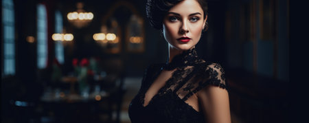 Portrait of a beautiful woman in a black dress in a vintage interior
