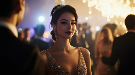 A woman dressed in a shimmering gown stands confidently at a vibrant celebration. Surrounded by guests, the event is filled with lights, music, and joy, highlighting the festive ambiance.