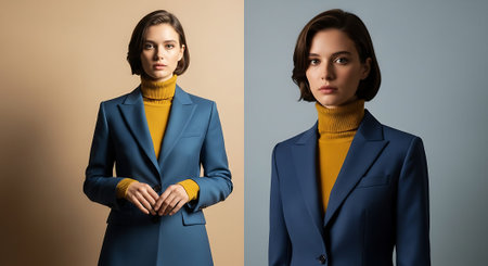 A woman in a tailored blue suit and yellow turtleneck, shown from two angles, exuding a confident and professional mood.