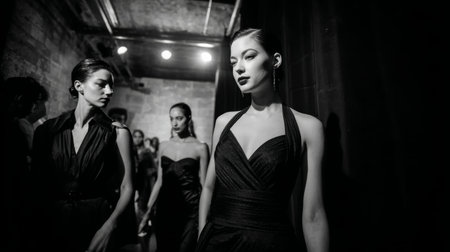 Models stand quietly backstage at a fashion show, waiting their turn to walk the runway. Their black dresses catch the low light as they prepare for the show.