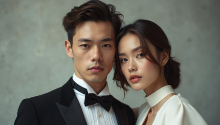 A striking couple poses closely together, exuding elegance and sophistication against a muted gray backdrop. Their confident expressions and stylish outfits create a captivating atmosphere of romance and glamour.