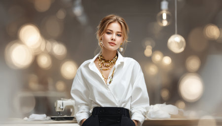 Elegant small business owner white blouse wearing layered necklaces and sitting by sewing machine