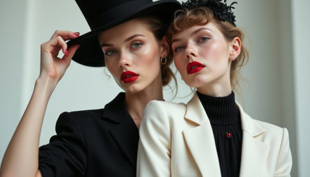 Two stunning women, one in a chic black blazer and the other in a stylish white suit, exude confidence with striking red lips. Their captivating poses and fashionable accessories create a powerful visual statement, celebrating modern elegance and individuality.