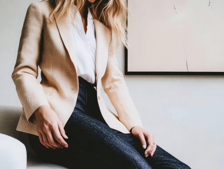 Woman wearing a fitted beige blazer over a white blouse, paired with dark jeans, single-button closure, blonde hair in loose waves, light background