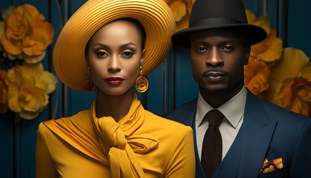 African American man and woman in a yellow coat and hat. Beauty, fashion.