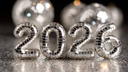 Shiny number digits 2026 in a reflective mosaic design evoke celebration and modern style. Silver tiles create a luxurious, festive mood. Generated A.I.