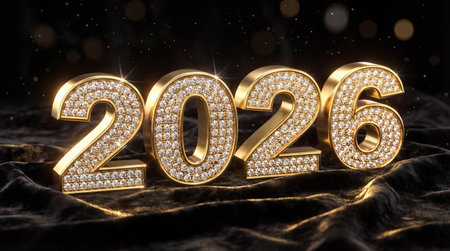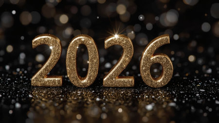 Stunning display of glittering gold numbers representing 2026 against a dark background, perfect for depicting celebration, parties, or new year themes in photography.