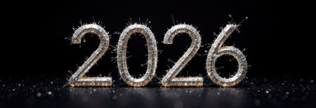 Sparkling silver numbers 2026 celebrating the new year against a sleek black background, providing ample copy space, ideal for festive designs and web banners