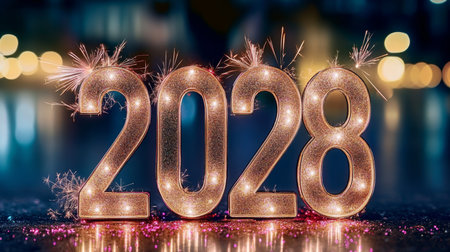 Sparkling New Year Celebration Illuminated 2028 Sign with Fireworks and Festive Bokeh