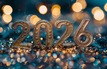 Sparkling numbers representing 2026 create a dazzling New Year celebration scene filled with glitter and bright lights, evoking feelings of joy and anticipation for the future.