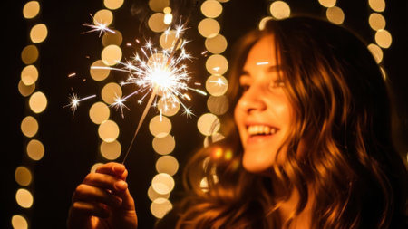 A close-up shot of a happy young woman with a radiant smile, holding a lit sparkler. The background is beautifully blurred with warm golden bokeh lights, creating a festive mood.