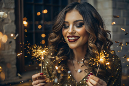 Beautiful white female with sparkles on her face holding sparklers in a festive background. Concept of celebration, party, holiday joy, magical glow, Christmas, New Year.