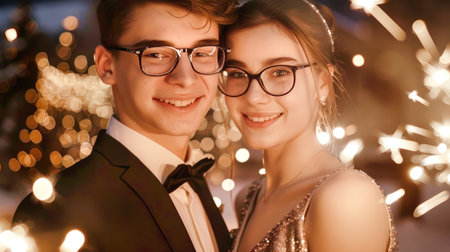A young couple in formal wear smiles for the camera, holding sparklers in a festive setting. The image captures the joy and excitement of New Year's Eve celebrations.