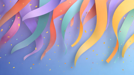 Colorful ribbons and confetti falling against a vibrant blue backdrop create a celebratory atmosphere