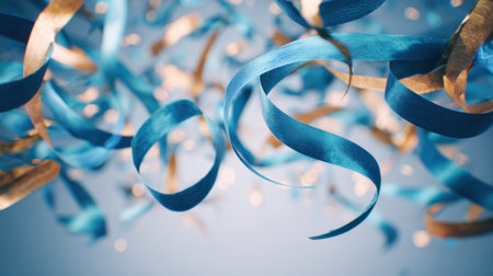 A playful mix of blue and gold streamers swirl through the air, creating a vibrant and cheerful ambiance perfect for parties and festive celebrations.