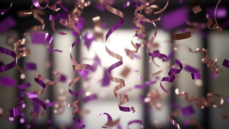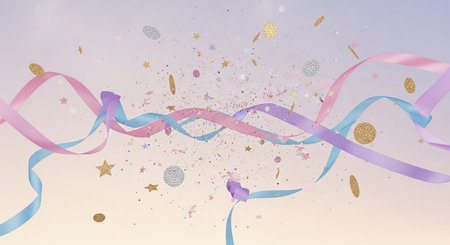 A dynamic scene featuring vibrant confetti and shimmering ribbons floating through the air, creating an exciting atmosphere ideal for festive celebrations.