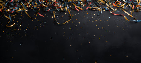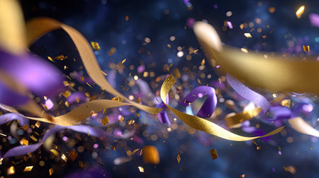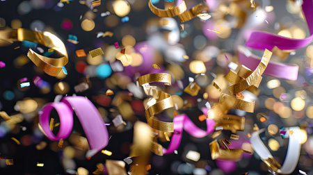 This captivating image captures golden ribbons and confetti gracefully swirling through the air on a dark background, creating a festive and joyful atmosphere perfect for various celebratory themes.