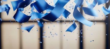 Vibrant ribbons and confetti dance in mid-air against a deep blue backdrop, capturing the essence of celebration and joyful moments. Perfect for festive themes.