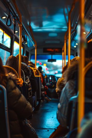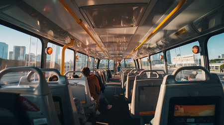 Passengers are riding a modern city bus at sunset, enjoying the urban landscape