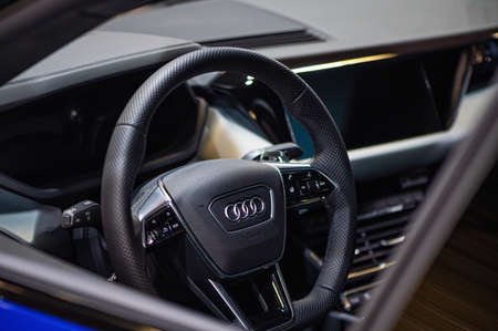 Riga, Latvia, Sep 24, 2021: Audi e-tron GT fully-electric luxury supercar, interior dashboard and steering wheel, model 2021