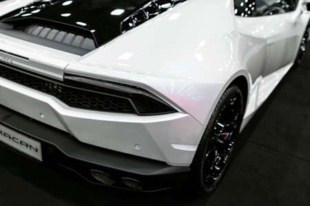 Sankt-Petersburg Russia July 21 2017: Side view of a White Luxury sportcar Lamborghini Huracan LP 610-4. Car exterior details