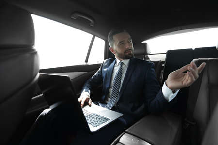 Serious businessman sitting at the front seat in his limo on a busy city street.