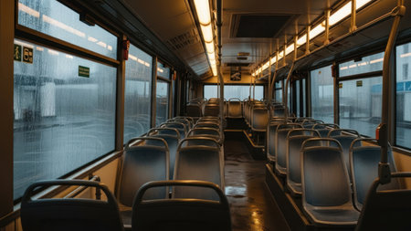 An empty train car interior on a rainy day, with rows of seats and a gloomy atmosphere