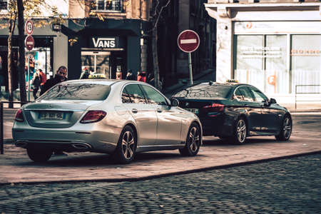 Reims France November 16, 2019 View of a taxi rolling in the city of Reims in France in the morning