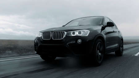 ALTAI, RUSSIA - 29 JUNE 2021: Black BMW X4 drives down the highway. FRONT view Close up