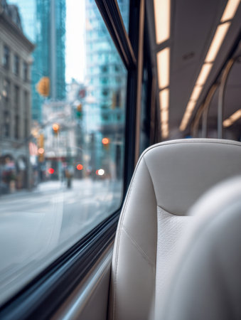 A solitary leather seat in a commuter train offers a quiet escape, with hazy cityscape and glowing traffic signals visible through the expansive window on a bright d