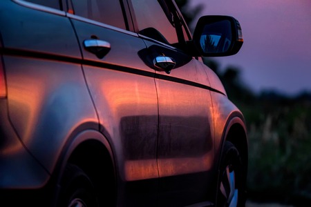 Side view of black executive luxury mini van car parked on the empty street focus in the door hande