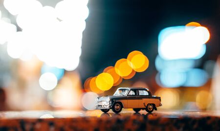 Colorful plastic and metal old automobiles toys. Classic cars beige, red, black and white colors. Old timer on yellow gold luxury background. Pattern.