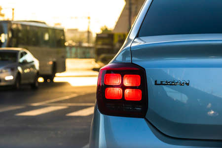 Car traffic at rush hour in downtown area of the city. Car pollution, traffic jam in the morning and evening in the capital city of Bucharest, Romania, 2020