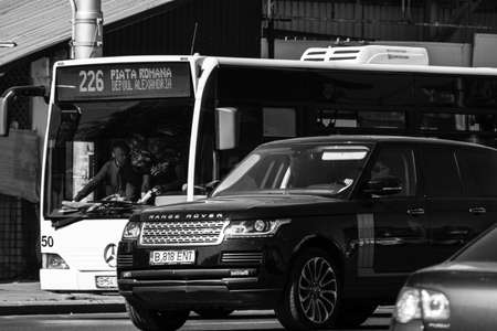 Cars in traffic at rush hour in downtown area of the city. Car pollution, traffic jam in the morning and evening in the capital city of Bucharest, Romania, 2021