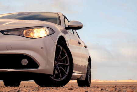 Performance Vehicle During Sunset. Sporty Looking Exotic Car Alloy Wheel Close Up. Automotive Theme.