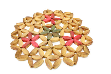 Six wooden hot plate stands in hexagon shape isolated on white background.
