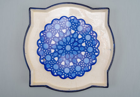 Spanish porcelain blue and white antique dinner plate in Andalusian style flat lay and copy space