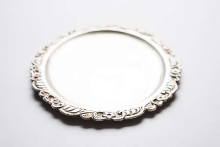 Stock photo of empty or blank silverware or oval shape plate with decorative border, isolated over white background, selective focus